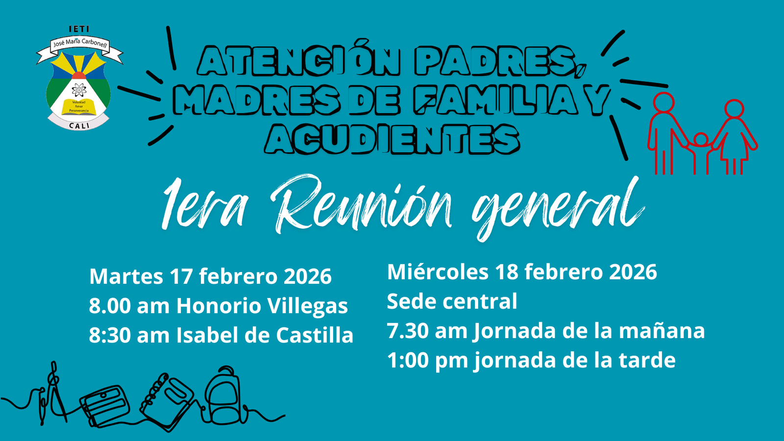 Durante los dias martes 17 y miércoles 18 de febrero de 2026, serealizará en cada una de las sedes de la Institución Educucativa  la primera reunión de padres de familia.